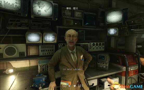 先不要通过微波墙,等对面的老头罗斯说完话再通过这里。老头关掉微波墙之后,和门互动,触发剧情动画。
