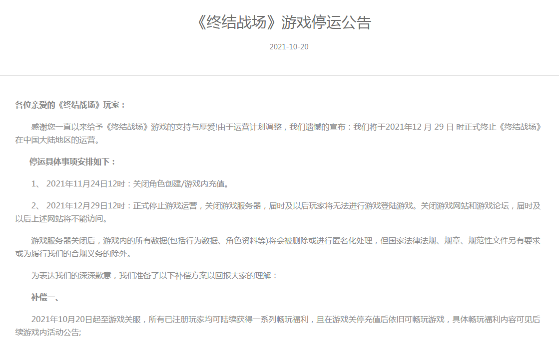 然而如今,这个当年的“五巨头”之一,却落得停服的结局,不得不让人感到唏嘘。游戏公告中已经说明,《终结战场》将于11.29的12点正式停止游戏运营。