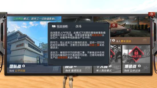 目前,游戏中拥有团队战、8V8推塔模式、6人混战赛车、个人竞技和5V5爆破战这五个竞技模式。其中8V8推塔模式算是融合了时下MOBA游戏中的一些元素,此模式下玩家间的装备数值保持平衡,而技能、芯片等附加养成技能会产生作用,防守方可以充分利用各种防御工事来抵抗对方的进攻,而攻击方则可以生产工程坦克,加上自身能力对敌方基地进行击毁,相比于团队战和个人竞技将更具有策略性和团队合作。混战赛车模式也是游戏中的一个亮点玩法,玩家将驾驶汽车竞速,当然路途中出现的各种道具,击毁对方或者用速度取胜,还是很轻松有趣的一个模式。
