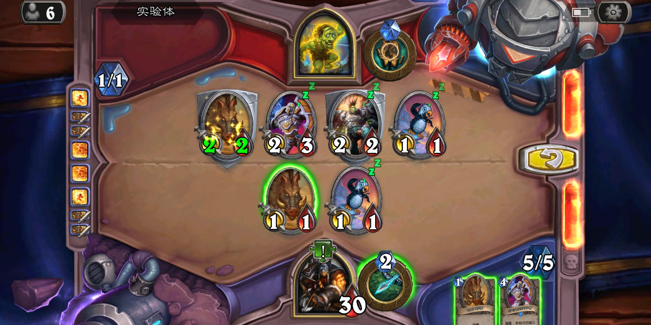 2-4-5孵化器选择孵化脏鼠,旋风斩,脏鼠拉脏鼠,冲锋贴给活化狂战士后交换手牌,裸脏鼠,最后活化狂战士撞在满血脏鼠上。