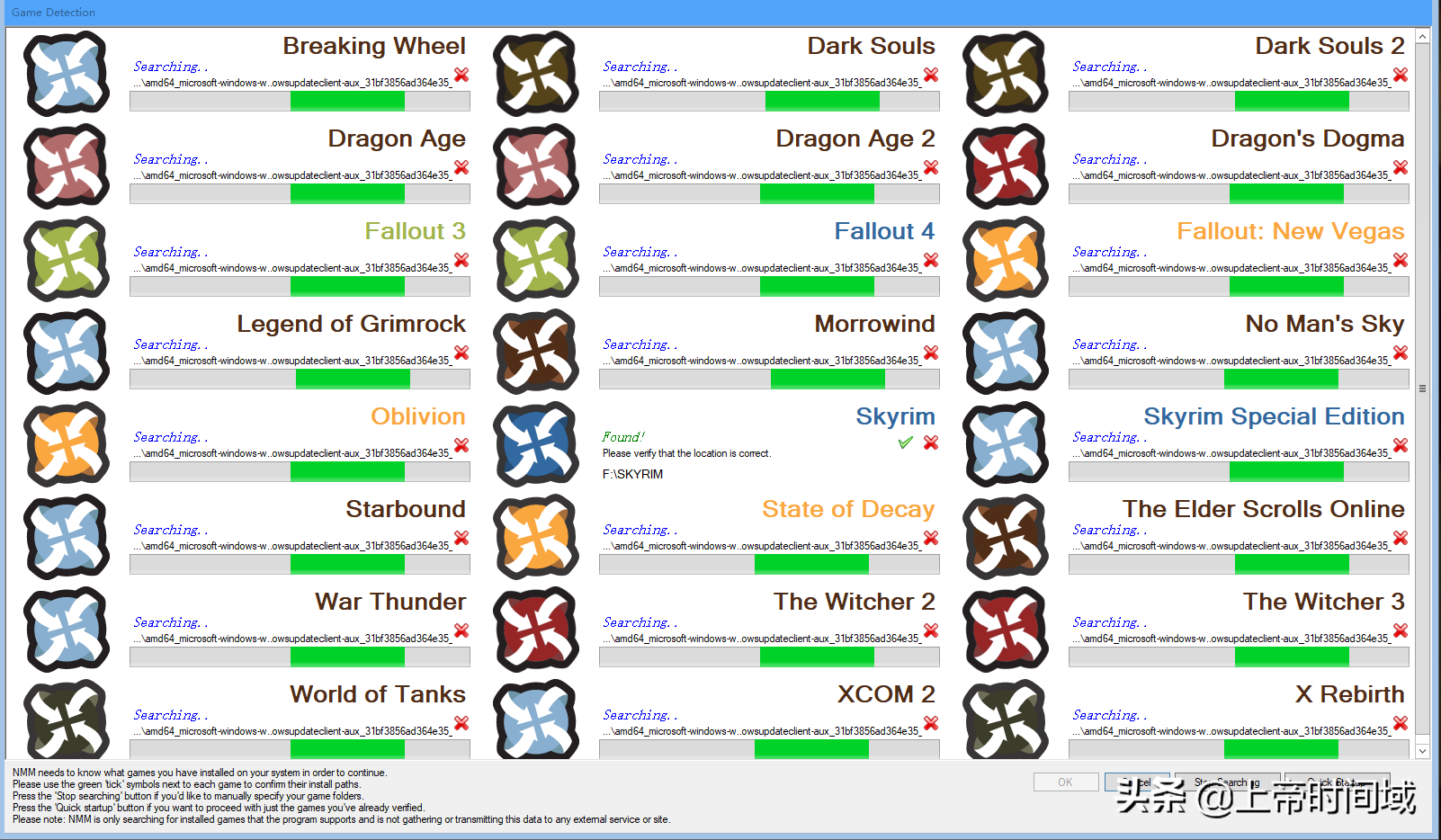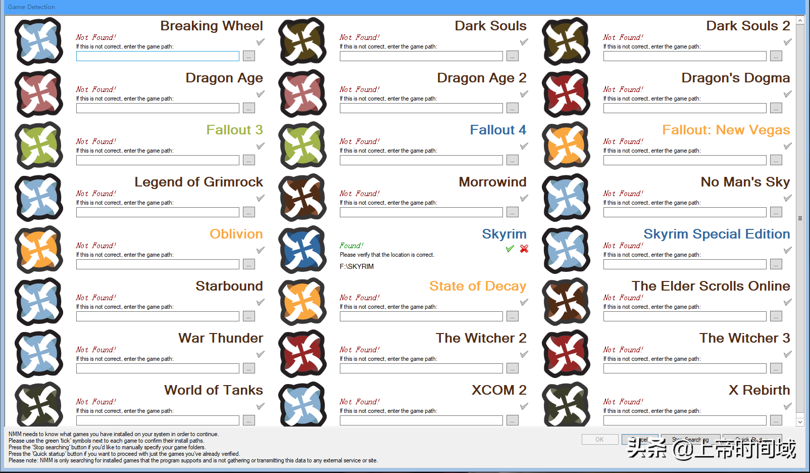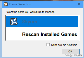 直接X掉所有的游戏,只留下SKYRIM!然后,点击OK!此时,我们需要注意一点,使用NMM时,《上古卷轴》的游戏本地必须在硬盘的根目录文件夹,且文件夹中不能有中文!(说白了就是,把游戏安装成“D/skyrim” 就行了!)
