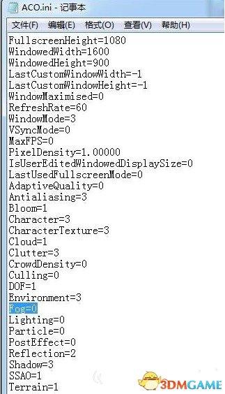 和《刺客信条枭雄》的解决方法类似,找到我的文档,Assassin's Creed Origins文件夹,打开ACO.INI,修改FOG=0(其实就是关闭烟雾效果)即可。如下图: