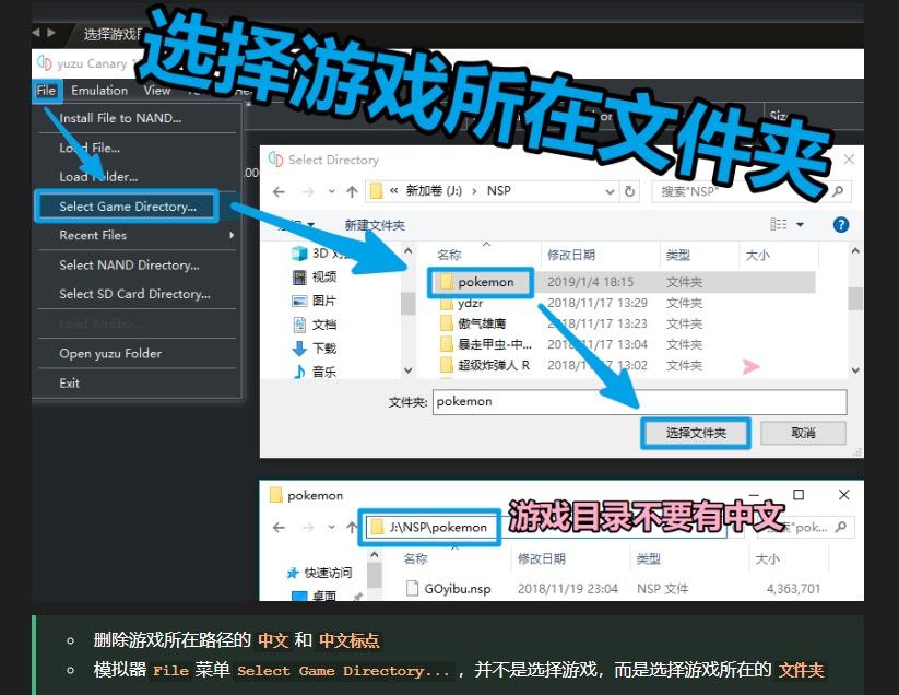 打开游戏有两种方法,点击文件-加载文件,选中自己下载好的nsp或者xci格式的switch游戏,或者设置游戏所在文件夹。设置好后所有已下载的游戏在主页显示使用更方便。双击添加游戏目录,选择存放switch游戏的文件夹。
