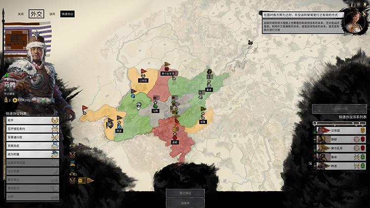 外交的重要性同样不可小觑,用纯粹的武力征服天下并不是一件易事,在某些极端的开局下更是如此。与他人结盟携手对抗大敌或是提供丰厚的条件来让它人领地成为你的附庸都是不错的选择。在出军远征时,谁也不希望自己后院起火。而玩家随时可以在外交部分查看当前地图上的势力与对己方的态度。与它人签订互不侵犯协议或是获得领地内的军事通行权这样的外交协定都能让自己在战略上获得不同的优势。而游戏中的快速协议部分也能帮助玩家快速找到目前那些符合条件的可行协议,省去一部分繁琐的操作当然,态度恶劣或是提出的条件过于“夸张”自然也会让交涉破裂,这也是玩家需要针对时局进行考虑的部分。