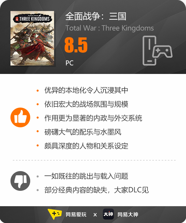 从公布之初后就经历了数次“跳票打磨”,最终姗姗面世的《全面战争:三国》果然不愧是Creative Assembly的一次巨献。本作不仅在系列的基础上踏出了稳妥的一步;还将玩家带回了山河秀丽,风景壮美的古代中国。别具神韵的水墨画风,精心安插的文言诗词,气势磅礴的古典配乐都让文化题材的亲和性变的更为明显,带来了一等的本体化体验。