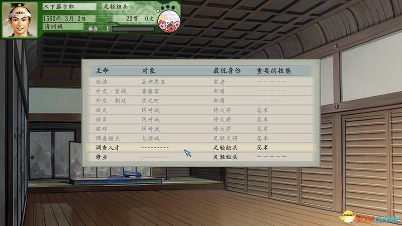 武士往往可以选择主命内容,例如图中调查人才或是修业。