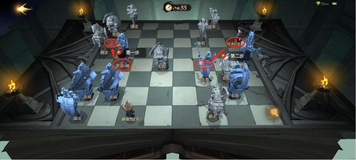在这盘棋中我们位置占优,所以打法也很简单,第一次走我们只需要先牺牲“罗恩”,让我们免受被对方的皇后将军。而我们的“哈利”可以在斜对国王的方位一步将军,需要走两步棋就可以做到。