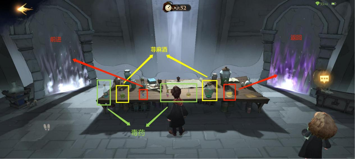 想要三星通关,我们需要先喝下左右两边的荨麻酒,再让哈利喝下右一的黄色药剂,选择通过紫色火焰的门,就能一次解决了。