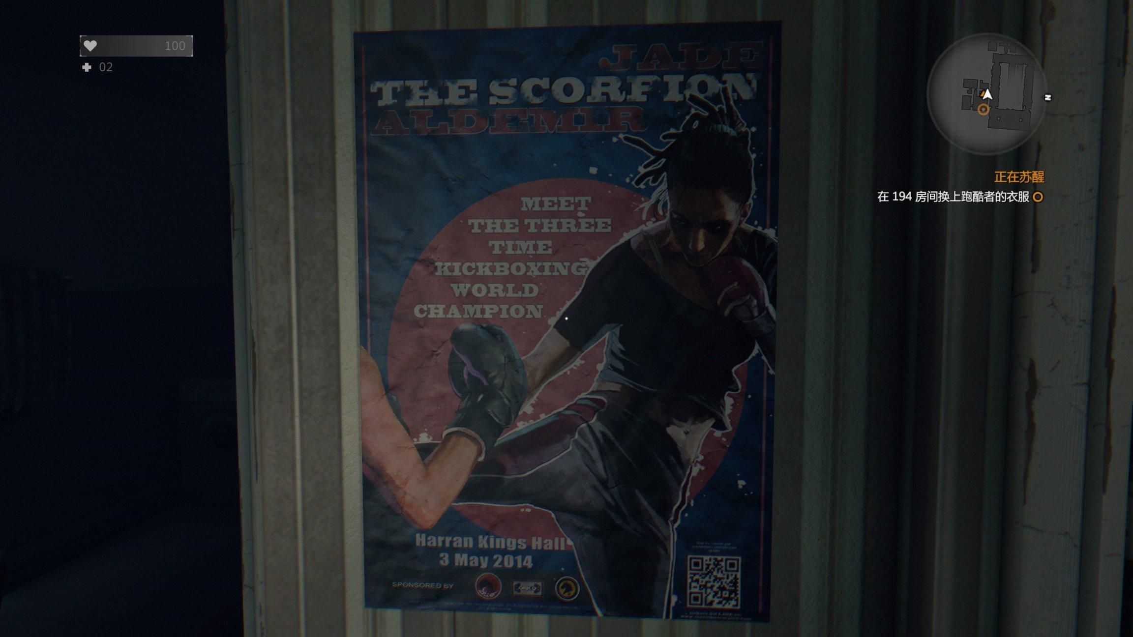 游戏的场景细节到你可以在剧情提及之前就推测到某些背景设定。在塔楼十八层的这里能够发现杰德的搏击冠军海报,就算前期玩家没有注意到,在游戏中期找赖斯谈判时,赖斯也会提及到这点。(右下角二维码的内容是哈兰市的官方网站,除了哈兰市的旅游导航,还有病毒爆发后幸存者在论坛的留言,玩家可以在网站里了解更多的游戏背景故事)