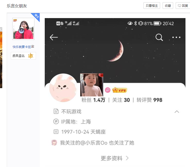 起因是有网友在论坛里发帖子,曝光出乐言的绯闻女友,而且这个妹子和乐言在WB上用情侣头像,一些动态下面也出现了和乐言有关的评论,因此网友们纷纷推测这个妹子是乐言的绯闻女友。
