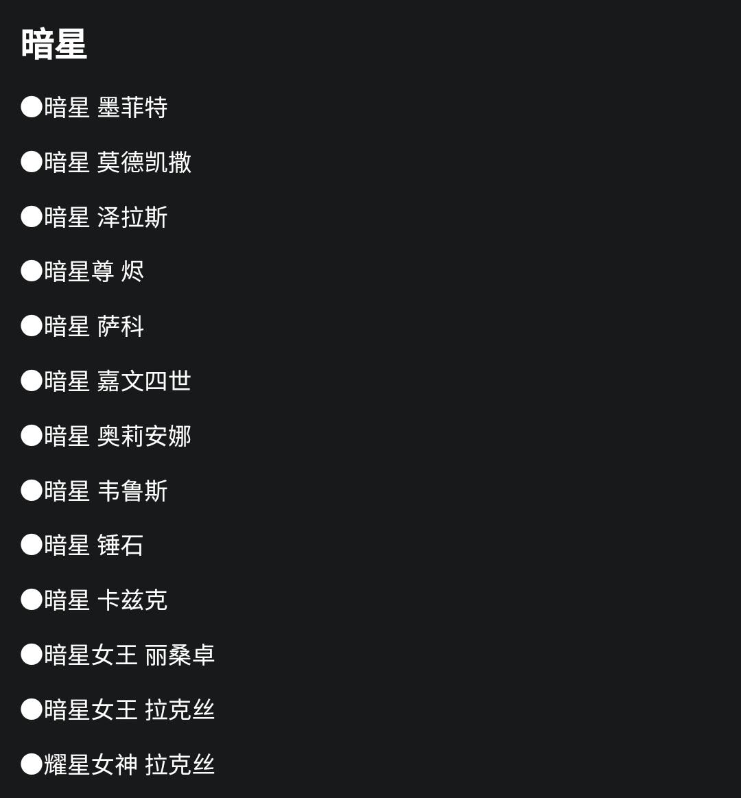 暗星有一些皮肤的质量还是不错的,T2的暗星尊烬、双生皮肤暗星女王/耀星女神、极具力量感的暗星锤石。T3的有大招是一片星辰的暗星莫德凯撒、w技能是不同星球的暗星泽拉斯、还有暗星萨科、奥莉安娜、韦鲁斯都是比较不错的皮肤,除了老了点。