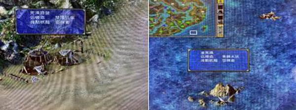在开放战略地图的界面上,游戏中频繁出现宝物、仙人、坐骑、神兽和妖魔,因此该系列游戏后来也被玩家调侃为《三国群魔传》。以《群英VII》中妖魔角色的出现地点为例,如图6所示:双尾妖兽出现在我国西部沙漠的“荒漠露营”、青鳞水妖则生活在远离大陆东南方的“沧霓礁”(图6右上方还有一个随机出现的水妖)、巨雪熊居于北方“浮冰岛”、黑玉妖蟒则盘踞在南方多泽地带的“黑水”。由此可见,西部、南部、北部、东部分别对应着沙漠、沼泽、岛屿、雪地的地理环境,它们不仅远离国人所居住的中原大地,更是我国仙侠奇幻类型故事中“四海之外”的妖魔鬼怪的盘踞之地。