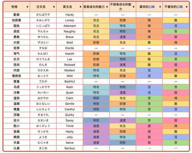 游戏中一共有25种性格,其中20种性格会对宝可梦的其中的两个属性有所影响,详见下表