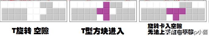 T旋转英文名为T-Spain,官方对T旋转的定义为最后一个操作为旋转,并且旋转后方块上下左右不能平移,成功消除即为T旋转。文字描述可能有些难懂,可以参考下面图示: