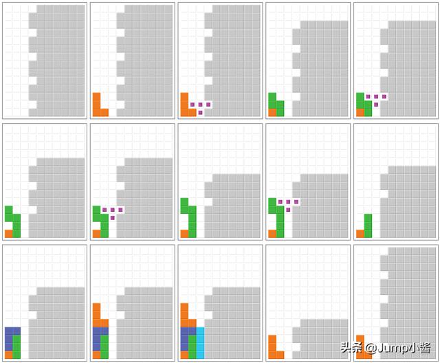 知道了T旋转的原理,那么离成功使用它就很近了。如果想要完成一个T旋转就要留下一个刚好能容下T形方块的空隙。根据判定标准我们还要让T形方块不能上下左右平移,所以需要在空隙的上面加一个“盖”。当成功构建好T旋转的架构后,只需要等待合适的方块落下,在最后一刻往正确防线旋转挤入空隙,就能完成牛X的T旋转了。