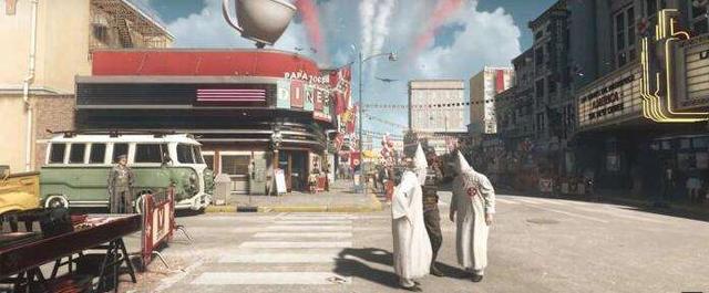 事实上,在《新巨人》中更进一层的,不只有角色的塑造和剧情的描绘,还有游戏背后的世界观。在本作中,玩家将更近地触摸纳粹治下的世界,并有机会深入被前作一笔带过的角落。游戏中,一方面向我们展示了骇人的纳粹科技,比如“毁灭者”号空天母舰(它甚至可以用抓钩吸起核潜艇)、位于新墨西哥州地下的实验设施,以及风驰电掣的火箭列车。同时,它还为我们提供了一个窗口,让我们有机会了解纳粹统治下的、美国的社会生活。