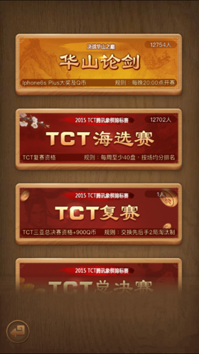 比赛模式中目前包括华山论剑和2015 TCT腾讯象棋锦标赛。两个比赛的奖励都非常丰厚,属于业余比赛,所有人都有参赛资格。