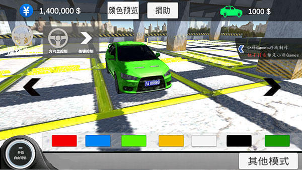 1、进入游戏之后,左上角可以选择【操作方式】,点击上方的颜色预览也可以更换【车身颜色】,设置好之后点击左下角的按钮开启自由驾驶。