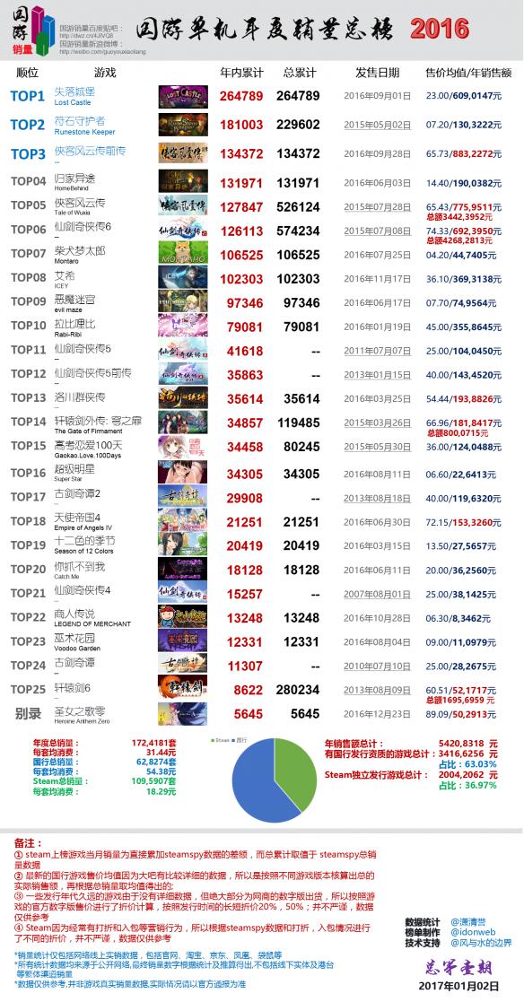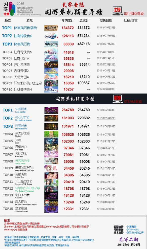 据介绍,此次销量统计是通过国行网商渠道和Steamspy统计销量分析汇总得出。可以看出,2016年9月28日上市的《侠客风云传前传》上市仅仅三个月就夺得2016年国行渠道销量榜的榜首,而于2015年上市的《仙剑奇侠传6》和《侠客风云传》仍然势头不减,拿下了第二和第三把交椅。