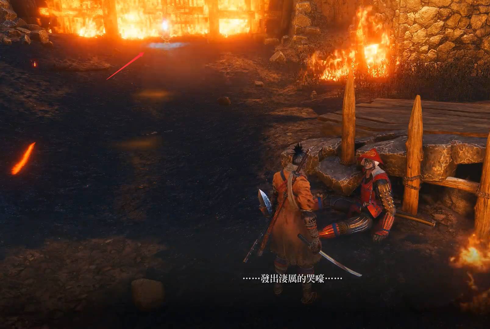 2、顺着这一条支线走(就是刚开始游戏的时候探索的路线,现在是原路返回)会来到一片火海的这个地方(原来小贩穴山摆摊的地方)在尽头会有一个鬼佛,这个鬼佛是单向鬼佛,与鬼佛对坐就会被传送到怨恨之鬼所在的地方。