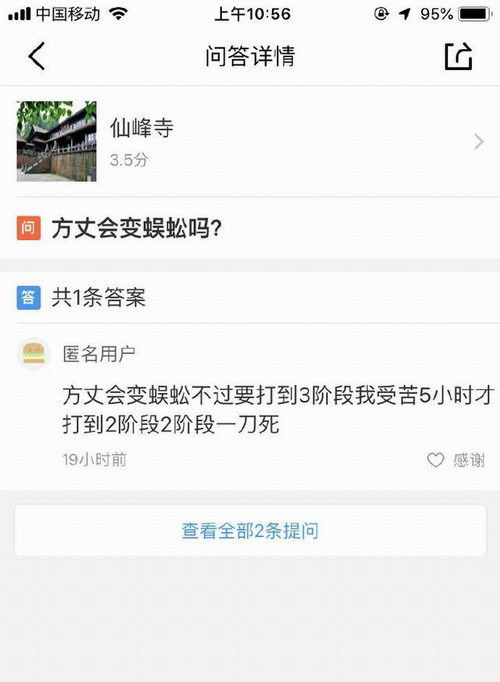 仙峰寺被疯狂玩家发现后,在旅游APP上关于这处景点的评论区里,便出现了一些很神秘且让人忍俊不禁的问题。没玩过游戏的人看到这些问题可能会一头雾水,但那些玩过游戏的人看到则会会心一笑。