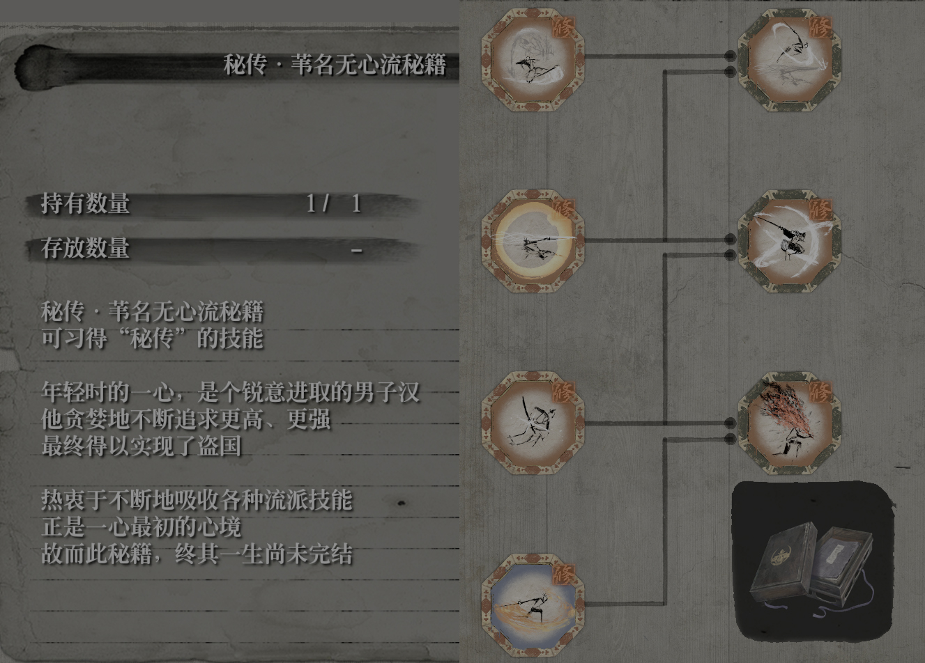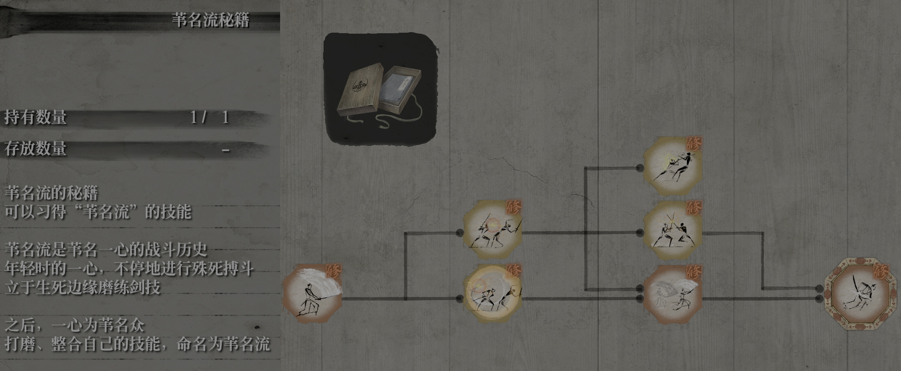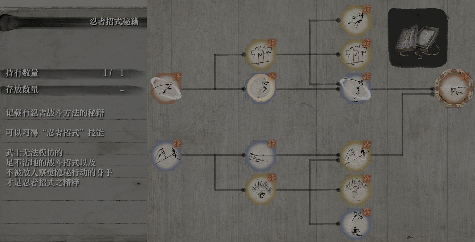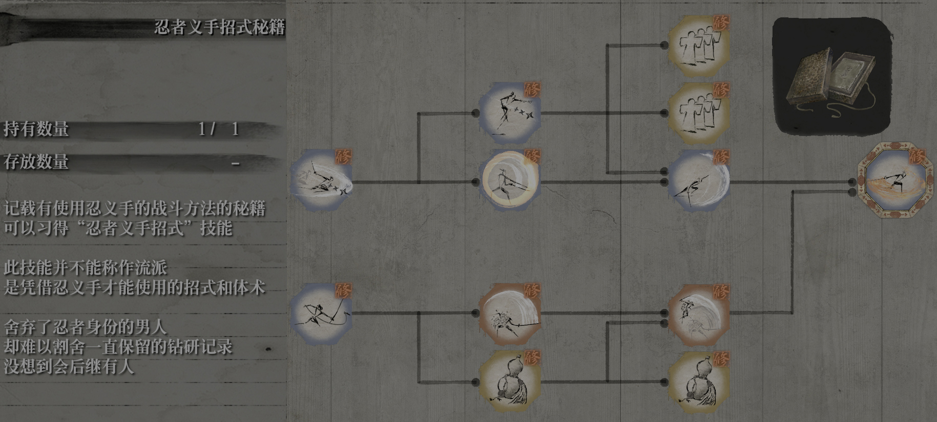 从苇名流的技能书中,我们会发现一个“忍杀恢复躯干”的技巧,独立于分支之外。
