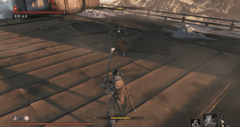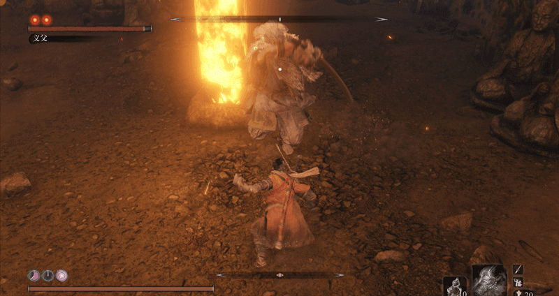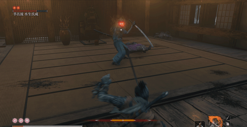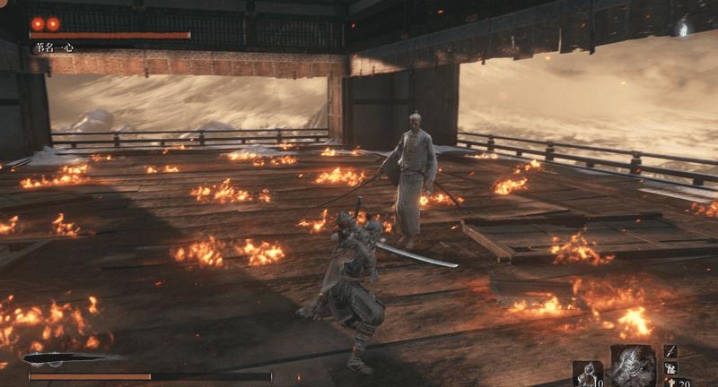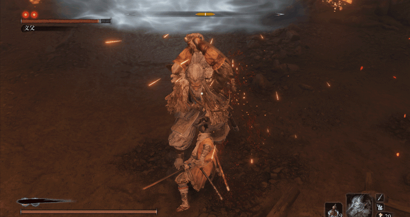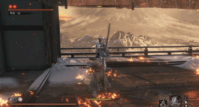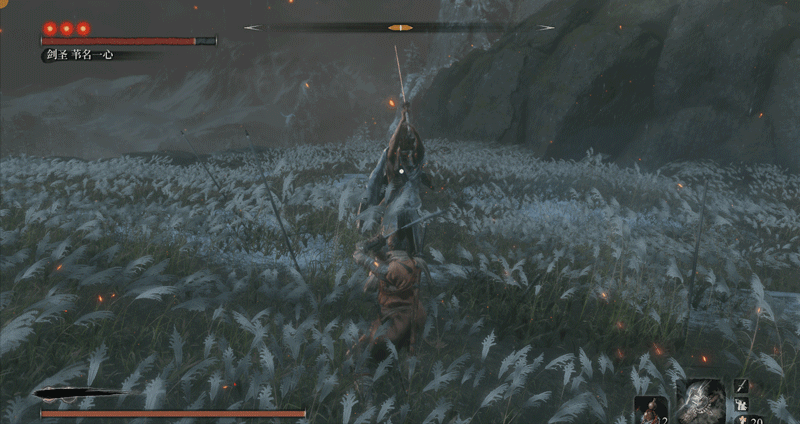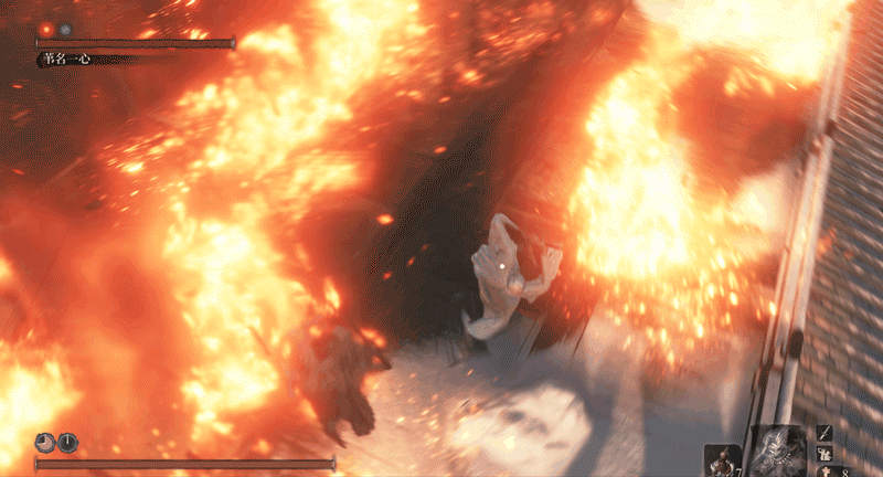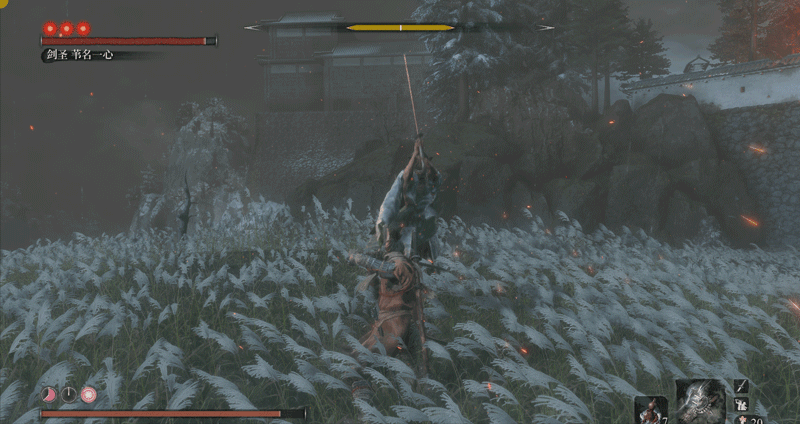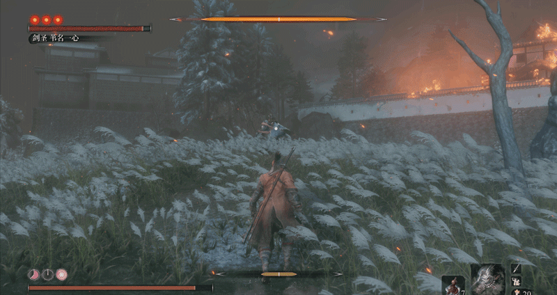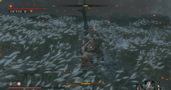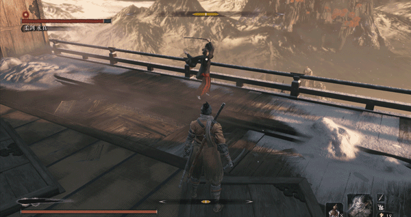 必须要说明一点,一心也有自己应对突刺的独特方法,当你在他身前使用突刺时,他会侧身避开(面对一些斩击时,他也会使出这招,这是一心的专属招式),而非用刀硬接,接着他会一刀横扫,打你个措不及防。而面对巨型忍者突刺这种长距离的快速刺杀,他就反应不过来了。