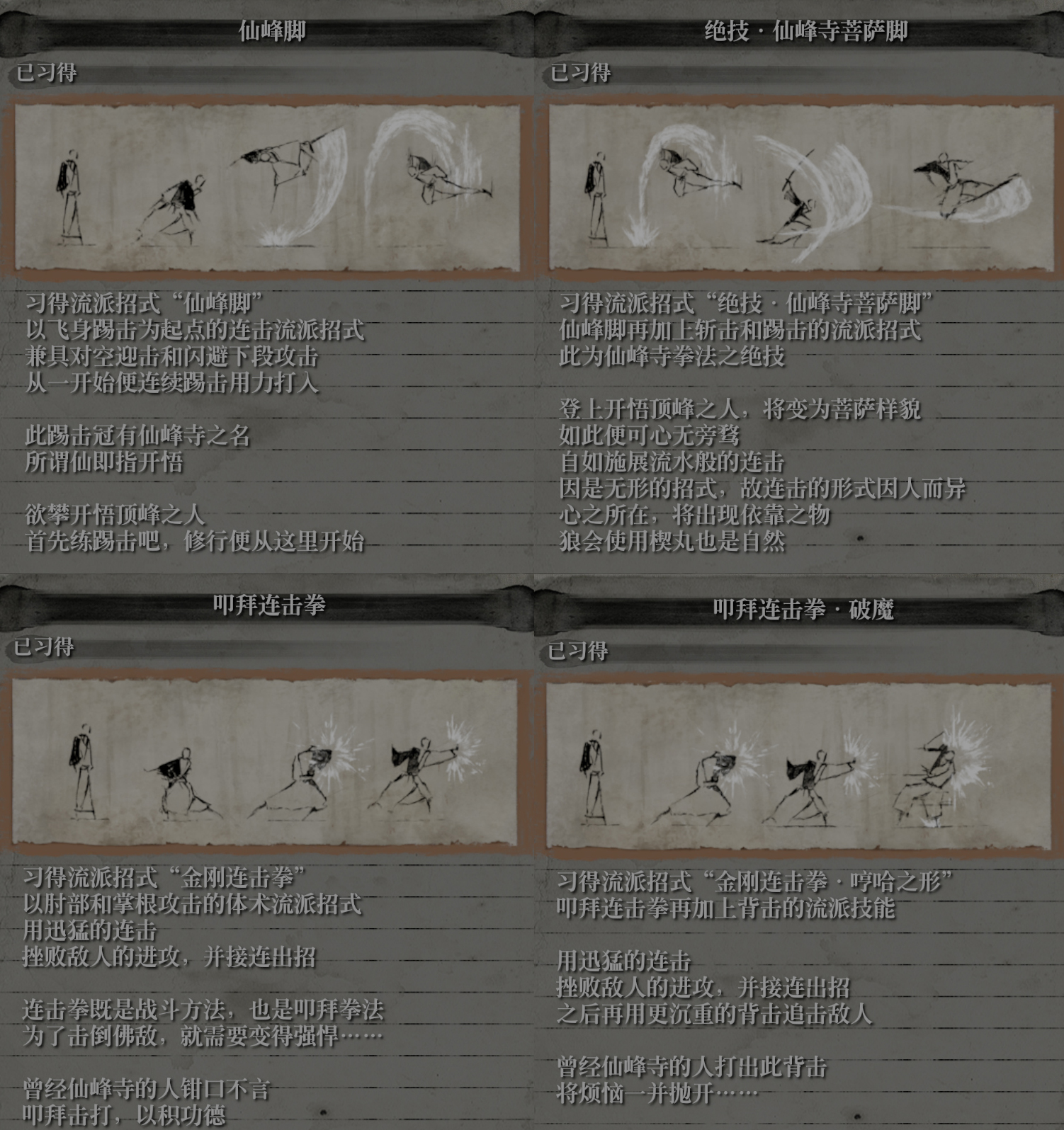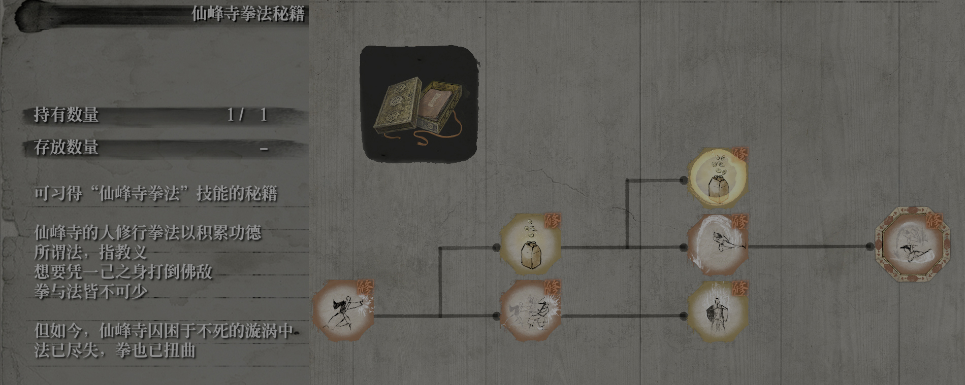 仙峰寺拳法,这套拳法,与游戏中的佛教 仙峰寺有关。只狼中有着浓厚的佛教文化,包括随处可见的鬼佛、佛珠,以及忍者杀死重要的人时,会立掌祈福(义父杀狼,狼杀老师 蝴蝶,狼杀义父),但这套拳法中的被动,却给了我一种,“嘴里全是教义,心里全是生意”的感觉。