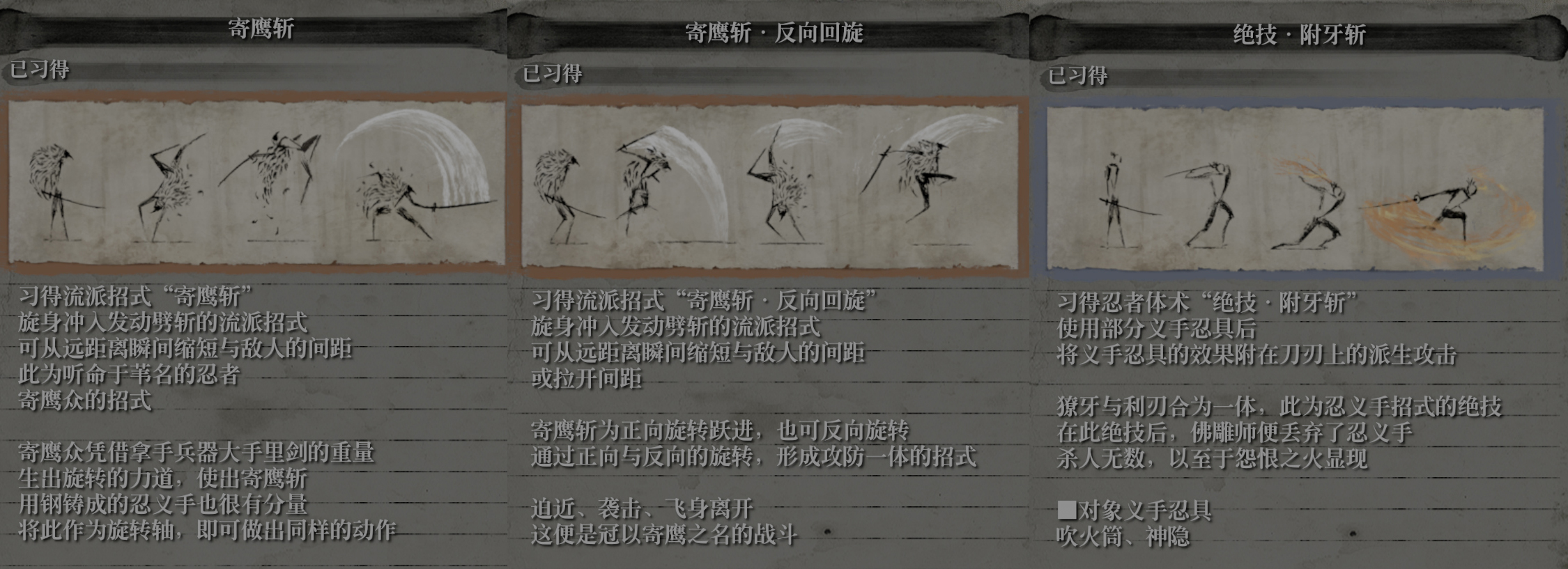 而佛雕师留给寄鹰众最后的礼物,就是促使他放弃忍者之道的“附牙斩”,这是在兵器上覆盖“烈焰”的恐怖招式,是只在一些高阶的寄鹰众里,才会见到的技巧(通常为黑羽 寄鹰众)。