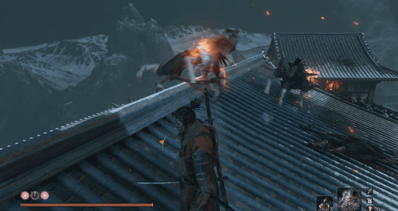 通常情况下,普通敌人即使挡住这次突刺,躯干也已崩溃,在空中降下时,即可对其进行进一步的忍杀。