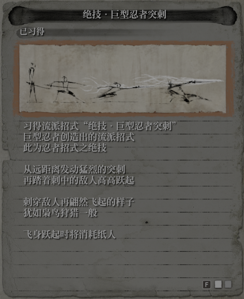 我们可以从技能树看出,想要领悟巨型忍者突刺,必须学会消音技巧,识破、忍者之眼(学会突刺,必须了解突刺),快速隐蔽(滑铲),以及空中防御、空中流派招式。