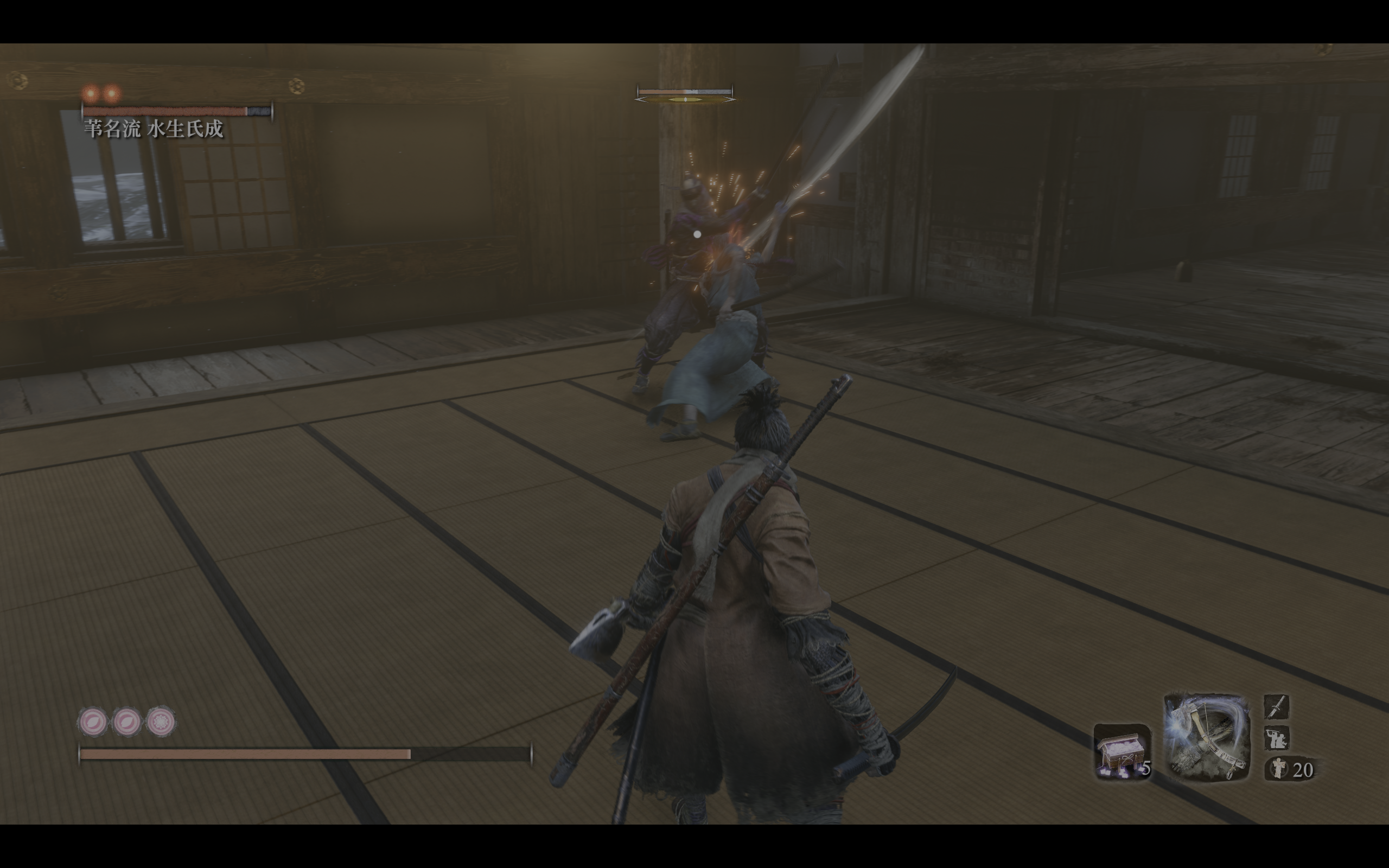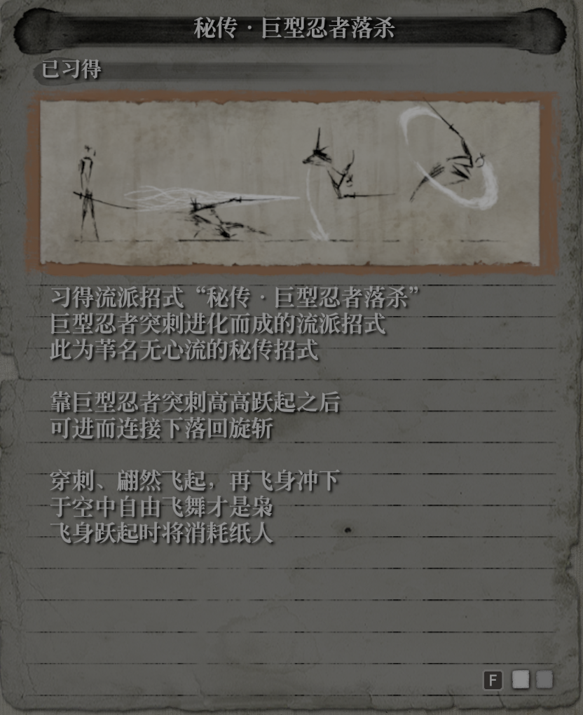 由于苇名一心也没有“忍杀”招式,于是,我主观认为这招与“源之水”无关的招式,是狼在参悟苇名流到一个阶段之后,自行领悟的属于忍者的技巧。