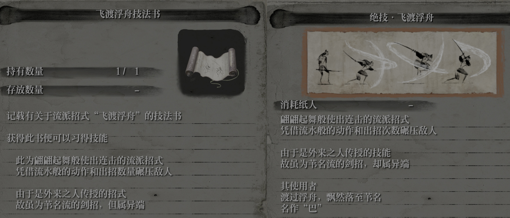 飞渡浮舟是由 巴 自源之宫传来的技法,也正是三年前,只狼以五枚宝鲤鱼鳞于坛中贵人(源之宫的人)处换来的。