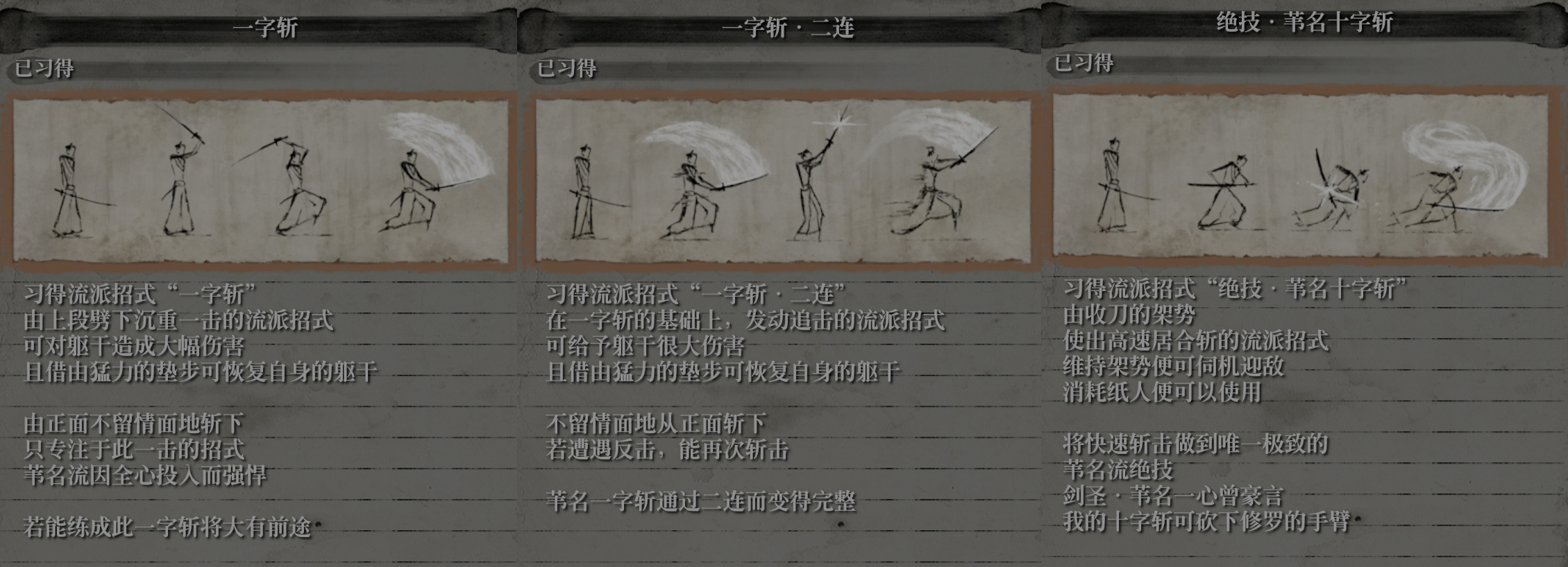 在游戏中,能够使用一字斩的角色,大概有如下几种类型的敌人,道场年轻武士,道场中年武士。路途中,只狼遇到的各个武士大将精英以及三年前的义父。