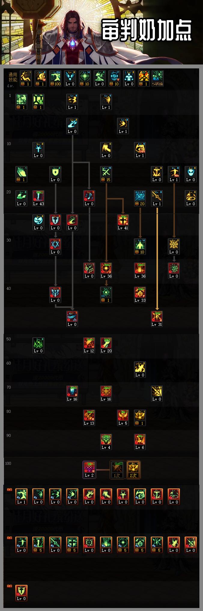 审判奶的加点比较简单,主要是考虑输出技能,其中BUFF技能除了圣灵之槌外,还需要点满光之复仇和神圣之光,因为三觉技能的新增,SP严重不足,所有考虑仅能的形态和伤害,这里个人推荐放弃60和70级的技能,其余的SP分配到圣光十字,圣光球或者是圣光盾,十分推荐选择圣光球。