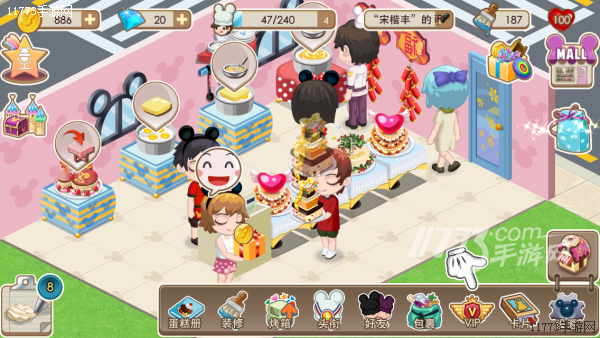 既然是蛋糕店,那自然是要做蛋糕的啦,玩家进入游戏后,贴心的新手指导会一步步教玩家改怎么完成一个蛋糕从制作到售出的全过程。基本的操作也都是以点按为主,如果玩家需要改变店内物品布局的话,只需拖动来完成,非常简单。