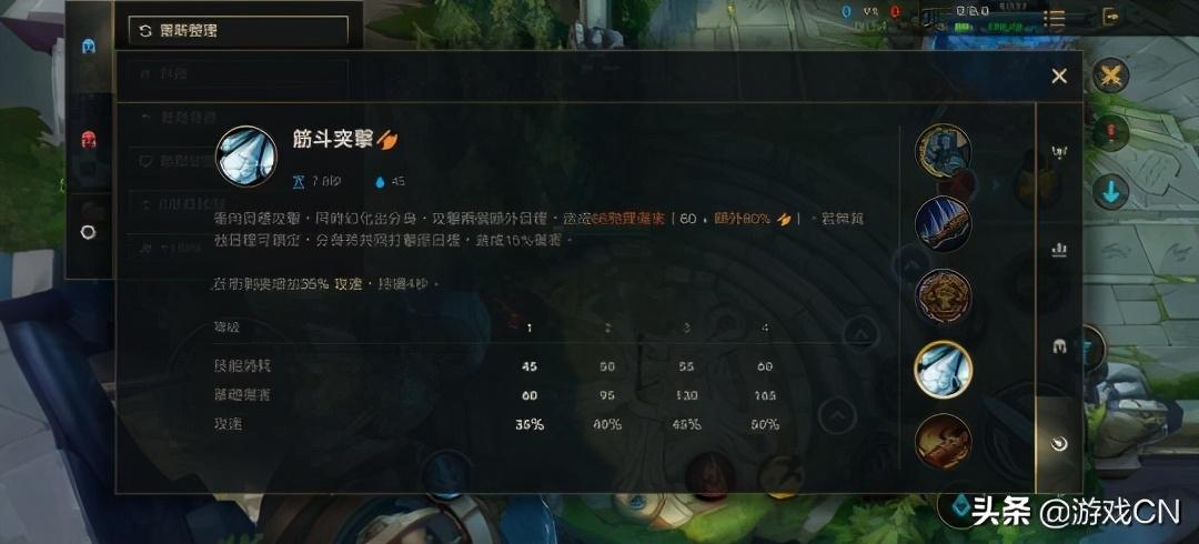 冲向目标攻击,同时幻化出分身,攻击两个额外目标,造成66物理伤害(60+额外80%AD)。若无其他目标可锁定,分身将共同打击原目标,造成15%伤害。在冲刺后增加35%攻速,持续4秒。