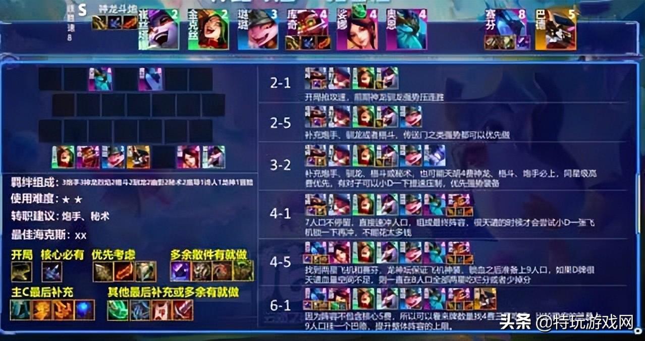 阵容羁绊:3炮手3神龙烈焰2格斗2驯龙2幽影2秘术2魔导1诗人1龙神1冒险