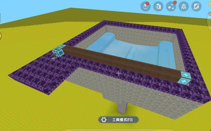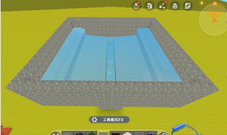 接下来,我们在塔顶造一个水槽。水槽的长宽都应该在8格。这里就触及到了一个冷知识,在迷你世界中,水流最多只能流到8格以外,因此玩家想要填满一个水槽,就最好造这样的一个这样的水槽。水既能填满水槽,又不会从中空的管子流下去。