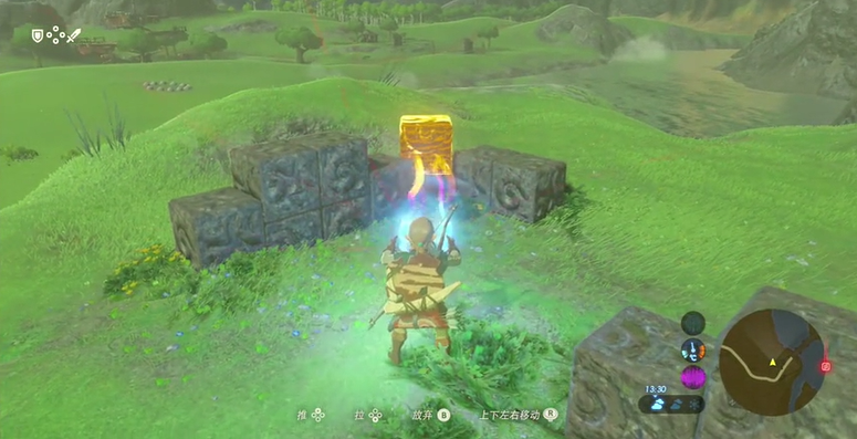 然后定住铁板来到一个机关面前,这个机关还是蛮好玩的,晃动手柄打击铁球再撞击石球,让其撞开石门就可以过去了,旁边的宝箱内是个古代核心,后期也是必要的材料。通过走廊后,引燃枯草,再将门板定住,踩动机关将石球弹起撞开门,进去后炸开石头就会得到100卢比。再利用时间静止将门撞开,进去打一下机关就可以弹起来解锁神庙了,后面有个宝箱记得拿。
