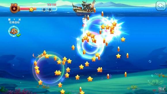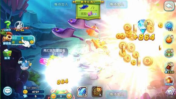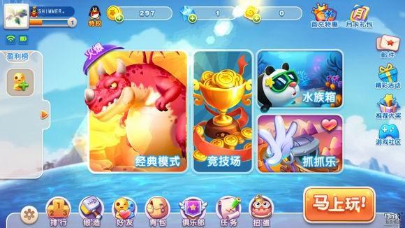 视觉主要表现在画面主打卡通风,而且整个UI布局从按钮到色彩均有一定的清新感,符合年轻人对视觉色彩的需求。在色彩之外,游戏中的鱼群都具备了拟人化,我们会看到在过场UI看到小恐龙偷袭小鱼,也在捕鱼的过程中看到鳄鱼、乌龟都会不同程度的自言自语表现。这些特征是区别传统捕鱼的第一个要素。