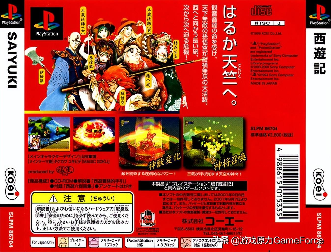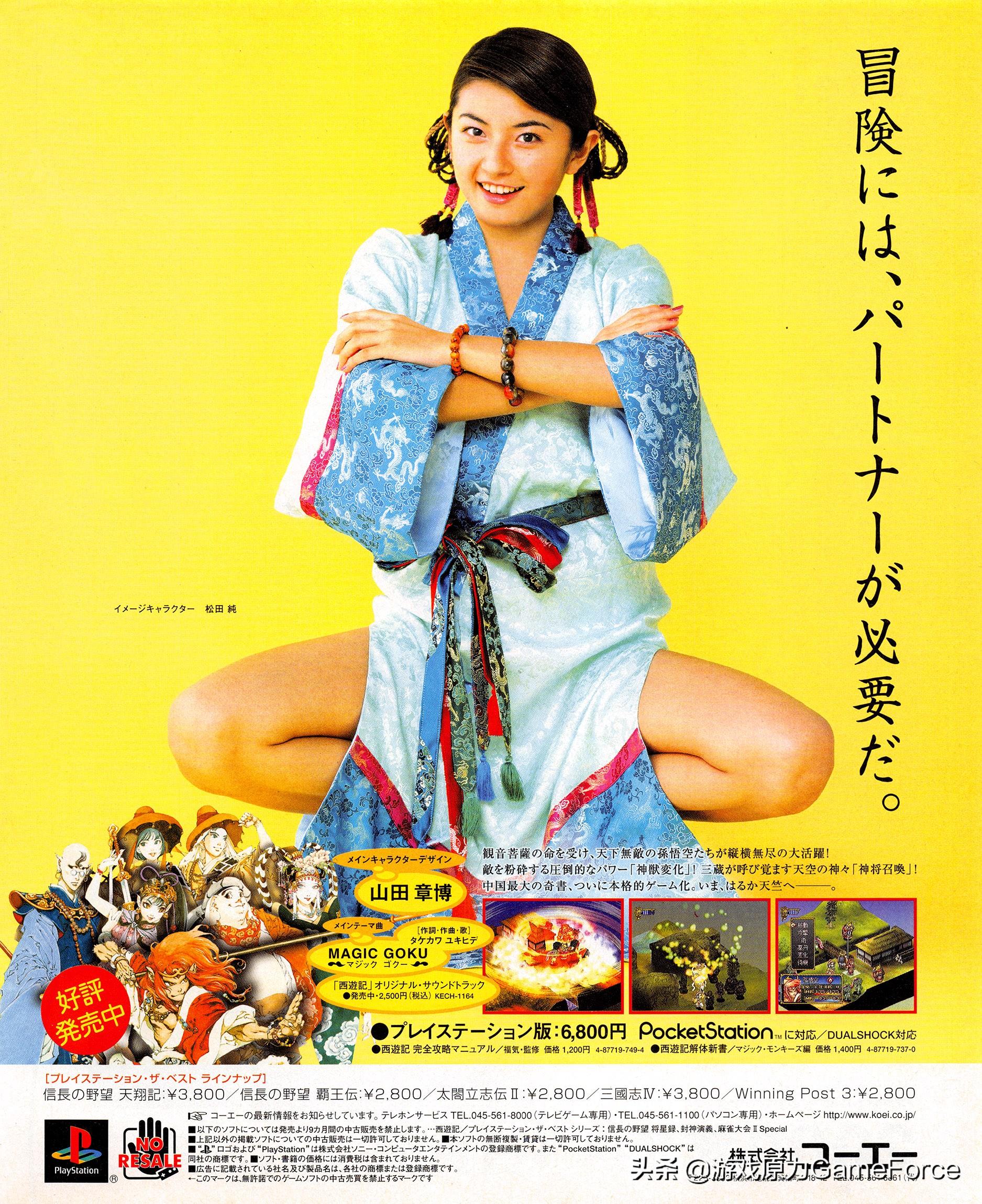 《西游记》,是一款索尼PS主机策略角色扮演游戏,由光荣开发和发行,1999年11月11日在日本发售,2001年8月15日在北美发售,游戏容量1CD。本作由山田章博担任角色设计,主题曲《Magic Goku》由武川行秀演唱,人气演员松田纯出现在游戏宣传海报中。