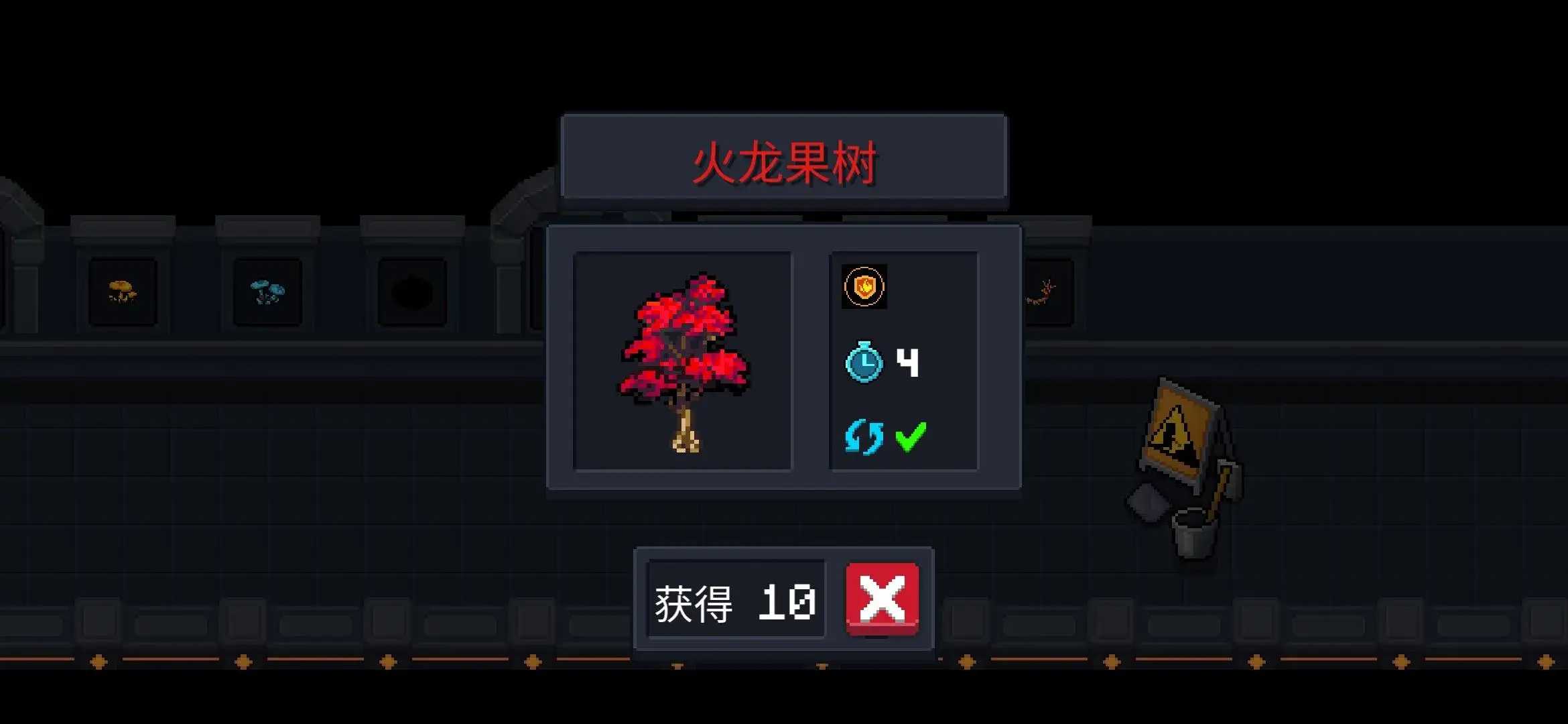 1.“火龙果树” 四天成熟,成熟后获得“火盾”,每天可收获一次。 循环使用。