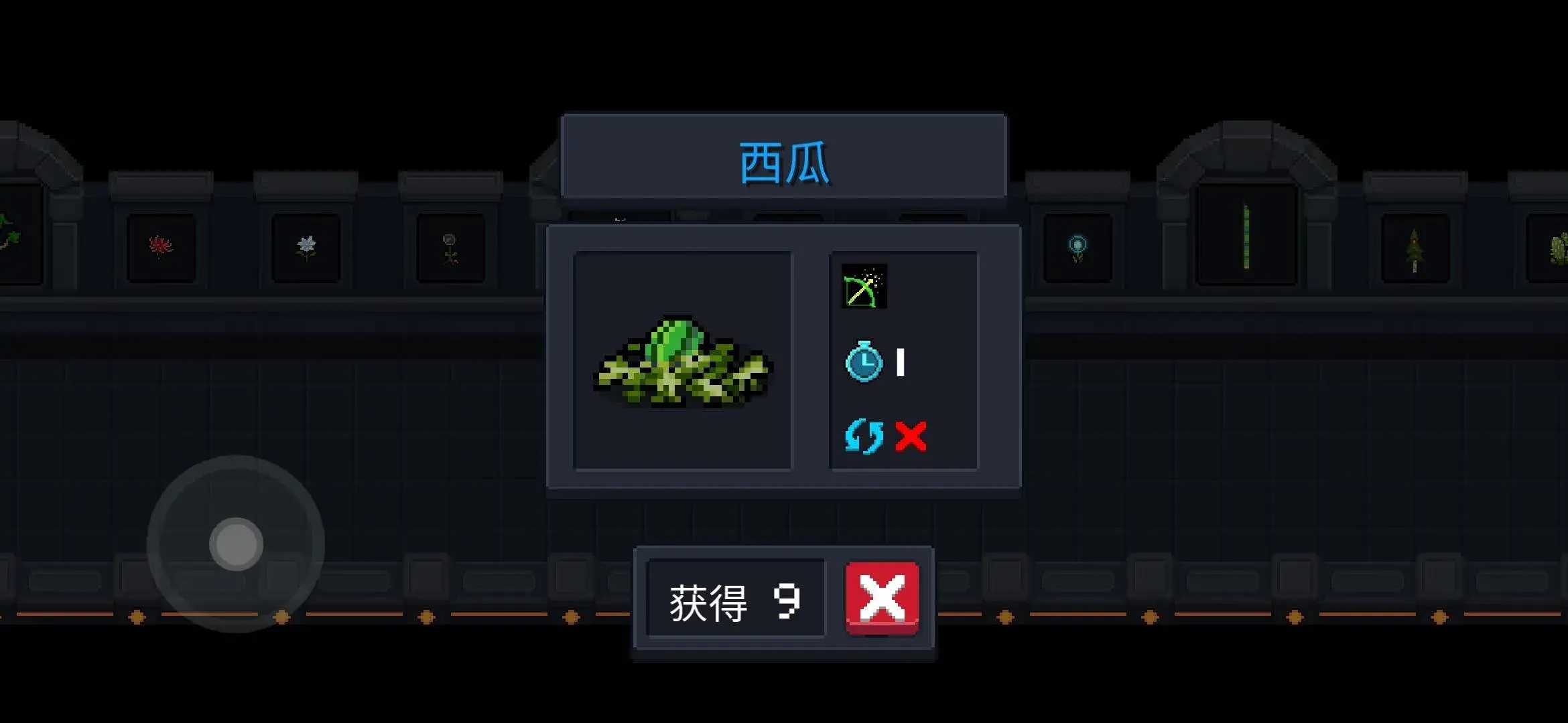 24.“南瓜” 一天成熟,成熟后获得“血瓶、蓝瓶、金币、随机材料、白武”,可收获一次。 不可循环使用