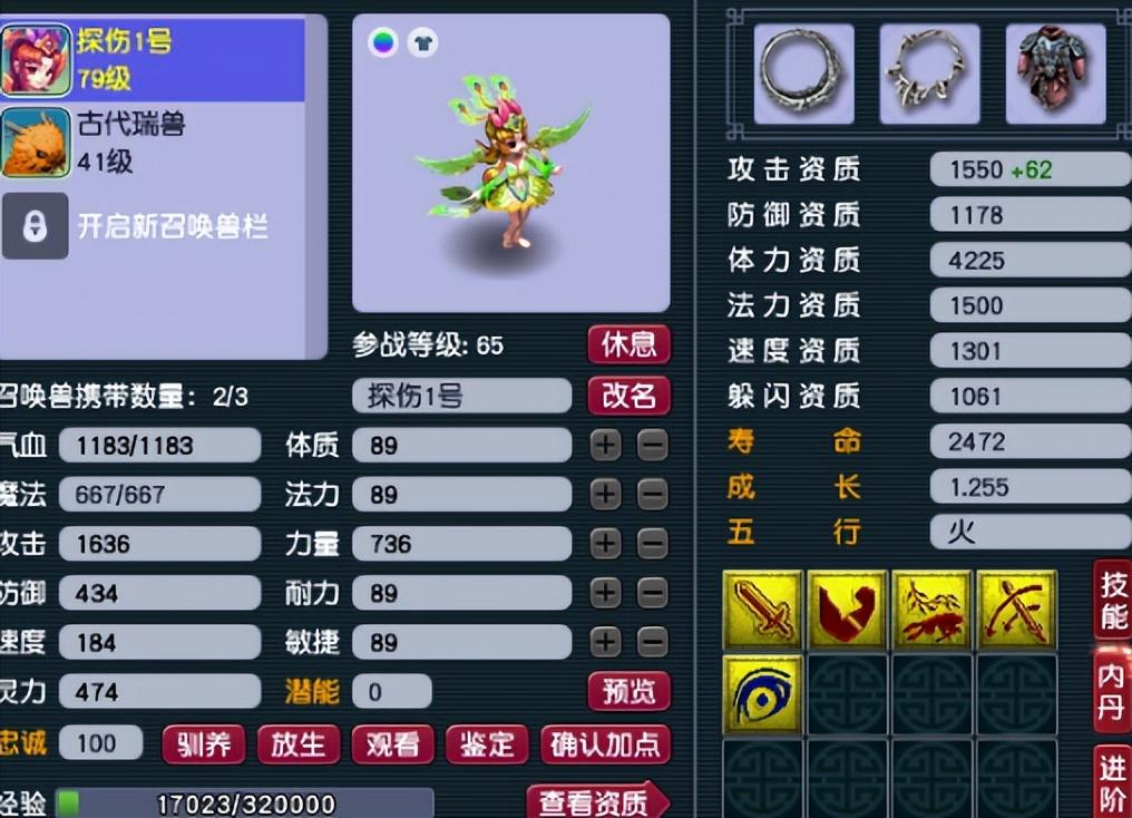 加点也是一点不掩饰,5力量加满。攻击资质也是显示到了绿字,超过了1600点。65级能携带的召唤兽,能有这资质已经很厉害了。我们看到成品之后,1636点的攻击力,还真的是挺暴力的。