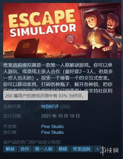 《密室逃脱模拟器》是最近推出的一款第一人称解谜游戏,可以让你在游戏中游玩交互式密室,支持单人或多人合作。目前该游戏在Steam上共有200多条玩家评价,好评率93%。