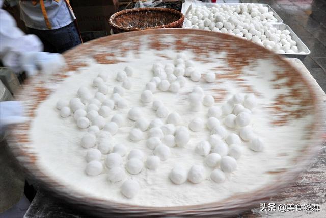 在以前,汤圆都是各家各户滚出来的,如今都用买的来代替。五仁馅里面有炒熟了的花生碎、芝麻碎、核桃碎、瓜子仁碎、南瓜子碎,加入白糖和猪板油,混合均匀,放入模具中压制紧实,切成小方块,然后把五仁馅用糯米粉一层层包裹,滚成汤圆,这样煮出来的汤圆能不想吗!祭完灶神后,把汤圆重新回锅,再给家人盛入一起吃。