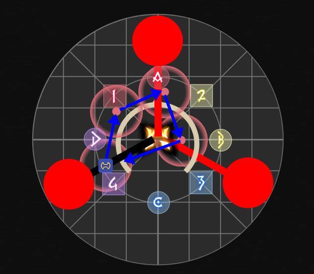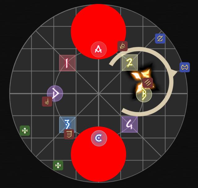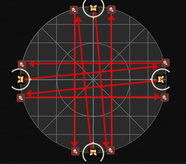 读条时除2个T在BOSS身下其他人先出BOSS目标圈。此时AC或者BD方向会连续顺时针出现4个灵泉。MTD1D3H1组负责A或B的灵泉,STD2D4H2组负责C或D的灵泉。奶妈需要贴场边连踩4个灵泉(灵泉为99%最大生命值的伤害,踩了灵泉会有治疗量提高的BUFF,灵泉没踩的话BOSS会有伤害提高=团灭)。