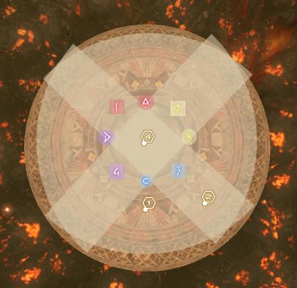 这里规定如果是8人分摊的话直接在九连环安全点分摊,如果是分散的话,MT和H2追着地火走到最远贴边,ST和H1在安全点方向贴边,D1和D3在安全点偏场内,D2和D4追着地火走到最远贴场中。图为假设九连环第一次爆炸区域为AC的情况。