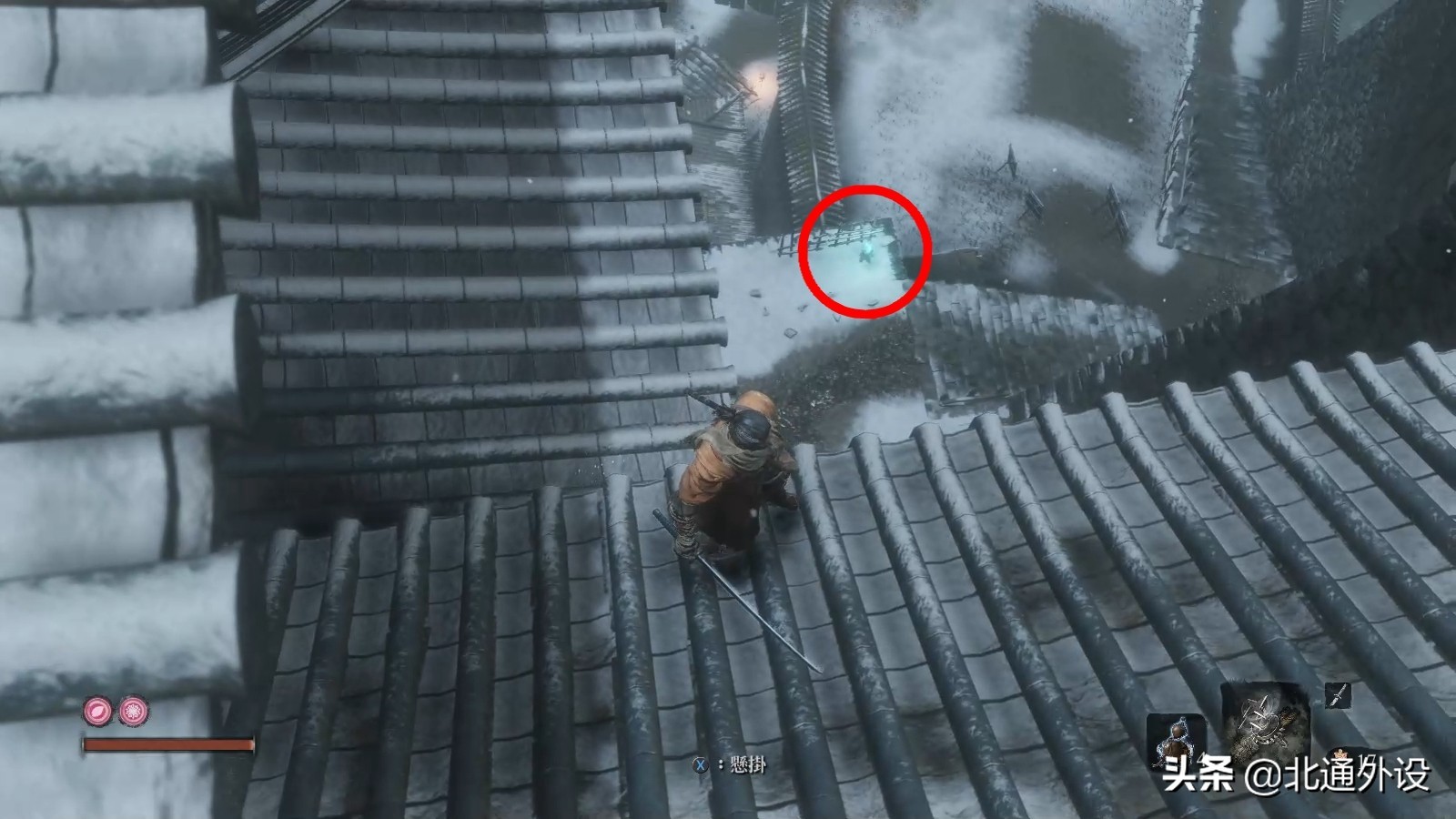 3.先来到对面房子中间的连接处,向下望可见到鬼佛“残留坟冢”。